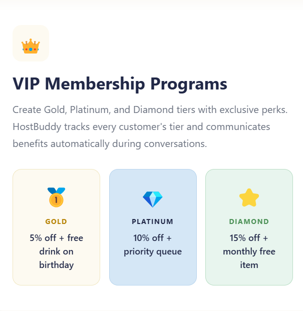 Customers earn points on every order. HostBuddy tracks their balance, notifies them when they’re close to a reward, and redeems points automatically — all through text or voice with no app needed.