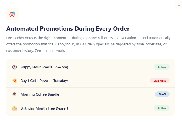 Yes. You can set up time-limited offers, happy hour deals, and exclusive VIP promotions that HostBuddy automatically presents to customers during their order conversation.